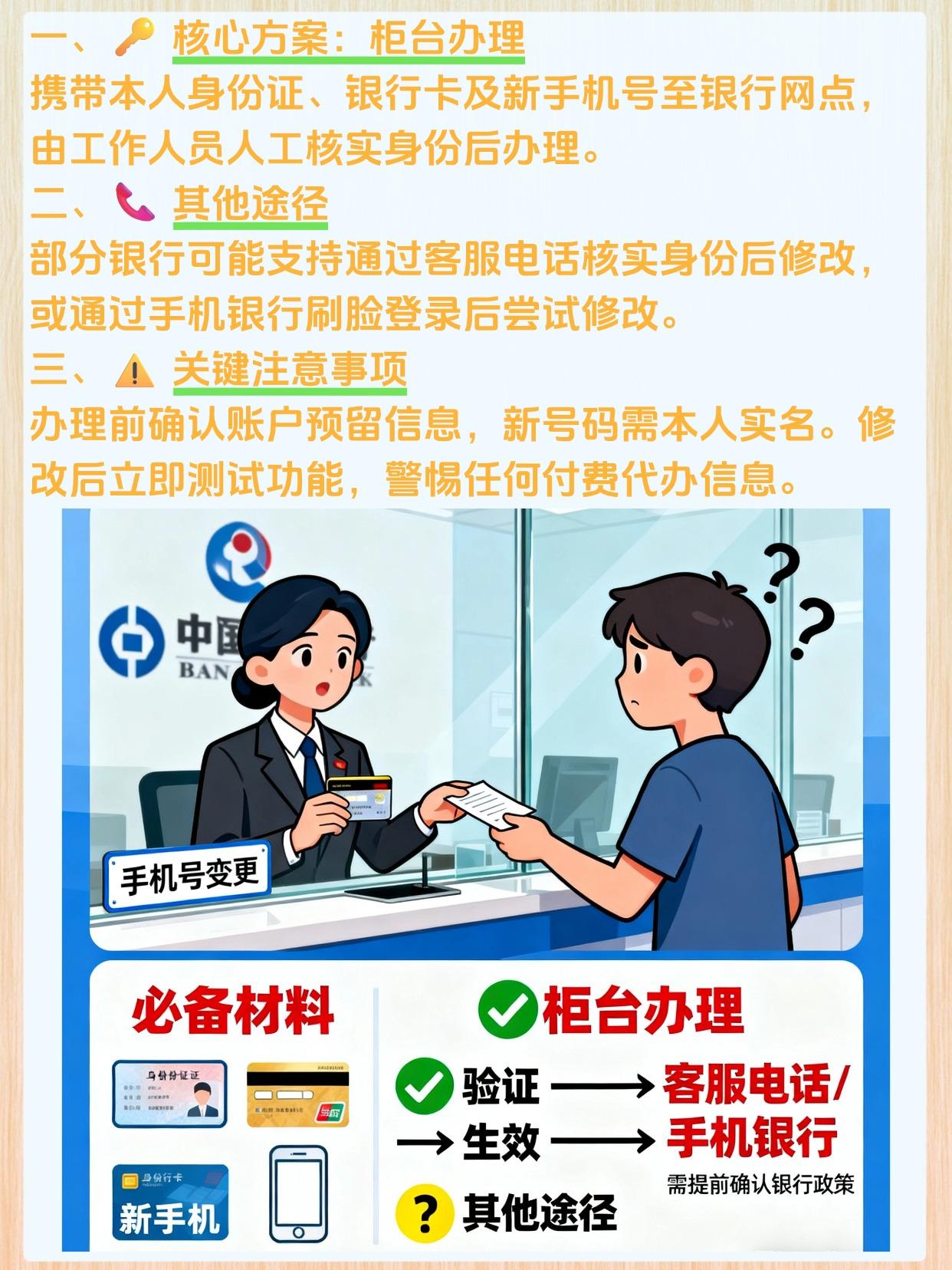 换手机号码要去银行吗更换手机号码不必一定要去银行,可通过网上银行或手机银行APP更改预留手机号。如仍需前往银行,可携带身份证和银行卡到任意发卡行网点柜台办理更改。... 2026-02-17 - [阅读全文]